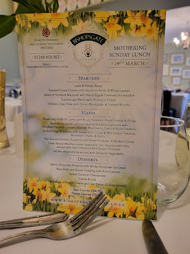 Read moreThe town of Beaumaris is very pretty with lots of quaint shops, all beautifully decorated for Christmas. Bishopsgate hotel is situated on the Main Street yet next to the sea , perfect for lovely walks and visiting the castle. We thoroughly enjoyed our stay, the rooms are a little dated but bedding was beautifully clean and bathroom had bath/shower which was lovely to have a soak after our 9mile walk earlier. Parking is available at the rear of the hotel. We had a Travelzoo voucher, which included a contribution towards the evening meal. Usually we tend to choose a local restaurant when going away, as hotel dining rooms sometimes disappointâŚ.but this hotel was the exceptionâŚour dishes were cooked perfectly and well presented, the staff were attentive and friendly. Breakfast the next morning was fabulous too, lots of choice..kippers, porridge, full English, fresh fruit, etc. We thoroughly recommend this hotel and...