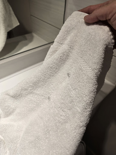 Washing my hands and face, I was met with a towel that looked like I'd cleaned a bike sprocket and chain with. 2 holes in it. Not exactly Premier.