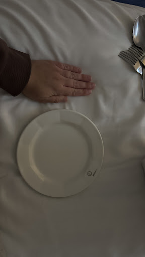Secondly the service; absolutely ridiculous, I had ordered food to the hotel due to not liking anything from their restaurant menu, I went to reception to ask for some plates as it was Chinese food. The woman brought out 2 very small what looked like teacup plates out (photo and hand for reference) and when I asked for something bigger she refused and said no they are for the restaurant??? Sorry is that a thing?? I have worked in hotels in the past and we never do things like that.