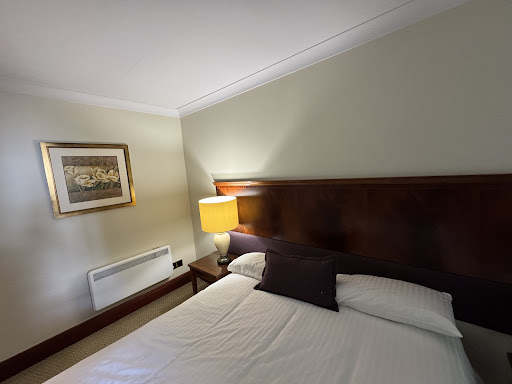 My room was in the ‘Garden Wing’ which sounded great, but due to a lack of any space resembling a garden and with full front exposure to the motorway it left questions open. Entering the wing felt a lot like something out of an old horror movie: Odd smells and long, dark, outdated corridors. The room itself was dark with only a dim light over the entrance and two bedside lamps, one of which had a faulty switch adding to the horror movie ambience. It also smelled quite ordinary. The bed provided one pillow per person, an old ‘decorative’ pillow and an even more worn ‘throw’ (at this point I was trying to find the advertised 4 stars). The bathroom was equipped with one bar of soap and some body wash which sat in a half empty pump bottle on the side of the tub. No hand towels, no shampoo, no conditioner… after a thorough search I did find some coffee and tea making facilities hidden in the cupboard which was nice. The view was the worst. The room was on ground level right next to the entrance to the wing which meant everyone coming and going walked straight towards/past my window. There were no privacy curtains, just a set of thick curtains to block the light. This meant the only option for some privacy was to darken the room completely, relying on the couple of dim lights provided, although there was still perfectly useable daylight outside. As a 4 star hotel describing itself as a ‘county house retreat encircled by gardens’ I would assign this room for storage, not to house guests.