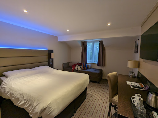 Very nice hotel. Typical premier inn with the upgraded rooms. Room has plenty of space and tidy size tv of around 32". Bed is spot on with nice pillows. Rooms look a lot more professional than the basic and business Travelodge rooms. The superior though is on par with decor but has coffee machine for the coffee conesour. The heating is a little bit poor not warming the room up enough for my liking. Other premier inn hotels offer radiators. Like Macclesfield north. Parking is good for cars and large box vans like the Luton or large Volkswagen/Mercedes crafter/sprinter. I drive a smaller Renault trafic and had not issues parking here. A nice Harvester next door with good selection of food. Would recommend. Reception staff friendly but I think Polish and will speak in front of you in their own language. If I could speak my native tongue of Welsh I would do the same back and see if they understood that. Other than heating and language of reception it was spot on. The Reception do speak to you in English when serving and were very polite so don't want to seem like I'm picking on them. Both ladies were lovely and always greeted me when entering the property. Sat nav does take you further up the road so if you are approaching with the premier/harvester on your left just slow down as you need to turn onto Racecourse road/drive then turn into car park to hotel....