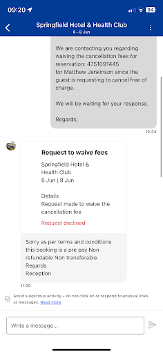 We called reception the week before to request a refund, to which they told us as we booked for booking.com, we would have to go through them. Booking.com team were lovely, and kindly wrote a request with the circumstances we were in and sent this to Springfield Hotel. Sadly they denied the request and sent us a message back saying we cannot offer a refund but we can rebook. I explained we cannot rebook, as we don’t know when my wife will be better as she has surgery and potentially more treatment to come and we’d be happy to foot any charges from booking.com. To which we were sadly ignored by the reception staff and I’ve attached our interaction in the photos.