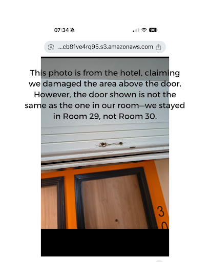 The hotel later sent us a photo of supposed damage above the door, taken from the corridor. However, the image appears suspiciousāit looks like two photos stitched together, and the door stopper (which should be visible) is mysteriously missing. This raises serious doubts about the photoās authenticity.