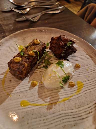 Our meal began with the Bread & Seasoned Cultured Butter, along with Maple Pea Hummus & Crackers and the Crispy Howgill Herdwick Lamb & Black Garlic. I was reminded of my first visit, which also started with the Herdwick Lamb. However, I had forgotten the portion was just two crispy-coated inch-square cubes with a dollop of black garlic. The portion sizes in fine dining can vary, and I made it last for half a dozen bites. It was decent. However, the bread, a highlight of our first visit, was a disappointment this time—plain white slices with a few seeds scattered on top, a far cry from what we had experienced before.