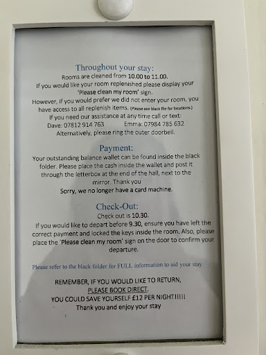 This was not the guest house for me. We paid the deposit through Hotels.com and I wanted to clear the remaining balance in advance so I knew everything was paid for. I rang the only number I had which was the landline number morning, afternoon and evening and nobody ever answered the phone. Eventually I gave up. The day before we arrived we got a text saying we needed to bring the remaining balance in cash and post it though a letterbox. According to the instructions in the booking the guest house didn’t accept cash and so I contacted Hotels.com about it and they said they would try and contact the property. Unsurprisingly nobody answered their calls either and they promised to get back to me. When we got to the guest house I actually rang the landline number to see if anything at all would actually ring and all I could hear was silence so I’ve genuinely no idea where that phone connects. We paid the cash into the envelope and posted it through the hole in the wall as there was a sign in the property saying they only accept cash which is not what was advertised. The location was excellent and the room was clean but despite having the radiator on full I went to sleep both nights very cold. Whitby may be the home of Dracula but the only thing that needed bleeding were the radiators. Apparently this is a professionally ran guest house and I would have thought they would keep on top of things like that but as we had no human contact or welcome at any point other than by text I’ve no real clue to be honest. I had a look around and for more or less the same price as we paid here I could have stayed elsewhere in a hotel even closer to Whitby with actual people to speak to, a bar, functional heating and a restaurant. The only real thing I can say aside from the fact the room was clean is that there was a lot of information available about things to do in Whitby. But I won’t...