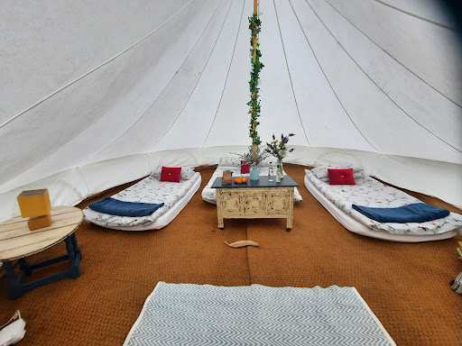We have just got back from staying at Oak Lodge and can hand on heart say it was one of our best camping experiences. Nathan and Maeve were absolutely lovely and couldn't have done more for us. The bell tents themselves are beautifully done out, lovely touches such as flowers and fairylights all added to the relaxing atmosphere. There are electric points too for charging phones etc. We loved having a fire pit and a BBQ and everyday Nathan would pop by to see if we were okay and needed more logs/charcoal. The toilet/shower facilities were absolutely spotless (cleaned on numerous occasions throughout the day) and really nicely done out too with Moroccan style wash basins and tiles...the powerful rain shower was a blessing too. We went with my husband and I plus our three young children (my 6yr old son and twin girls who turned 4 yesterday). Nathan and Maeve turned up in the morning with a unicorn balloon, a card each for the girls and a Llama birthday cake. Such a generous and kind gesture. The campsite itself is set amongst lots of mature oak trees, with a plane up a tree for the kids to play in (very quirky) and a pirate boat with ropes and rigging. My little gang particularly liked all the rope swings dotted about the site. The added bonus was the cafe which creates delicious coffee and beverages (all products bought ethically which I particularly liked). All in all...it is a fabulous camp site. We had a wonderful time (even in all the stormy weather). The kindness and friendliness of Nathan and Maeve gave a very warm vibe to the campsite and definitely made our camping experience for the whole family very memorable. Thank you so much. We will be recommending you to all our friends and hope to come back and stay again...