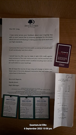 Read moreSome staff have been super great, very attentive when it comes to table service. Foods okay, when the chef remembers the ingredients. First nourish bowl was amazing, 2nd nearly missed out on the balsamic vinegar and the 3rd tonight it was totally missing just covered in the oil from the top of their mixture. I had to ask for it half way through as I was fed up by the incomplete dish tasting mainly of oil. Reception are brutally blunt (except Nancy who tried her best to be accommodating (she deserves a gold star) but management where blunt an offered nothing to assist, I had to quiz her on how I can ensure I wasnt sleeping on the street as my wallet and cards were lost in transit 2 "complimentary" cookies isnt really much of an offering) reception is lax at passing on messages to house keeping (asked for the shower gel to be topped up this morning but had to ring and politely request it now, 10pm at night) They say don't judge a book by its cover, but when your greeted with hostility and stubborness it's hard not have a sour taste. First impressions count, and the impressions here continue to disappoint day, after day, after day... Still here for 3 nights, fingers crossed there's not much else that could go wrong or affect me personally... Poor form for a Hilton Hotel, maybe I'm the problem with my expectations too high... Just an update, read the letter and look at my pic... Offered money off, written in brackets that it's "Noted on my booking" just order room service and check...