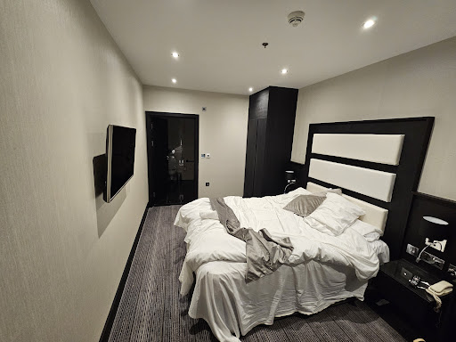 Room was small (not a bad thing) with no special view (again not a bad thing). Large window allowing lots of light in. Extremely practical with storage. Tea and coffee making facility within wardrobe area with biscuits, mini fridge stocked with muffins, and mini milks. Safe. Desk contained hairdryer. Mattress was very hard and uncomfortable so thatâs the only downside but of course others may appreciate the firmness. Walls a bit thin, or rooms a bit close. Either way could hear other people passing or talking (again a non issue personally as it didnât feel ârowdyâ or invasive. Was only noticeable at odd moments.) TV was large smart flat screen with Netflix and YouTube. Worked excellently.