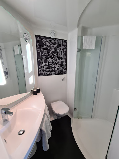 The bathroom was a traditional ibis pre fab and had towels, conditioning shampoo and shower gel. The shower was good and powerful. The outside wall of the shower unit on the bedroom side however had stains on the wall near to the bed which was also a concern.