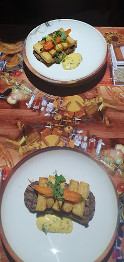 Table Placement Matters: Avoid sitting at the two tables located at the end of the restaurant. Unfortunately, the sound from the neighboring cabaret was so loud that it overpowered the speakers for the Petit Chef experience. Additionally, the projector at our table was blurry and went out seven times during the course of our meal, which significantly impacted the immersive aspect. This did not seem to be an issue at other tables. Kids’ Menu: The children’s menu was a major letdown. What was served felt more like a frozen TV dinner, with no flavor and no connection to the impressive culinary journey being showcased. Even children have taste buds, and they deserve a meal that mirrors the creativity of the experience. A smaller version of the adult dishes would be much more appropriate. Vegetarian Options: As a vegetarian, I was disappointed. The only adjustment needed for my meal was to replace the meat in one dish, but instead, I received flavorless alternatives that lacked any connection to the countries or the cooking showcased in the experience. It felt like an afterthought rather than a well-planned part of the menu.