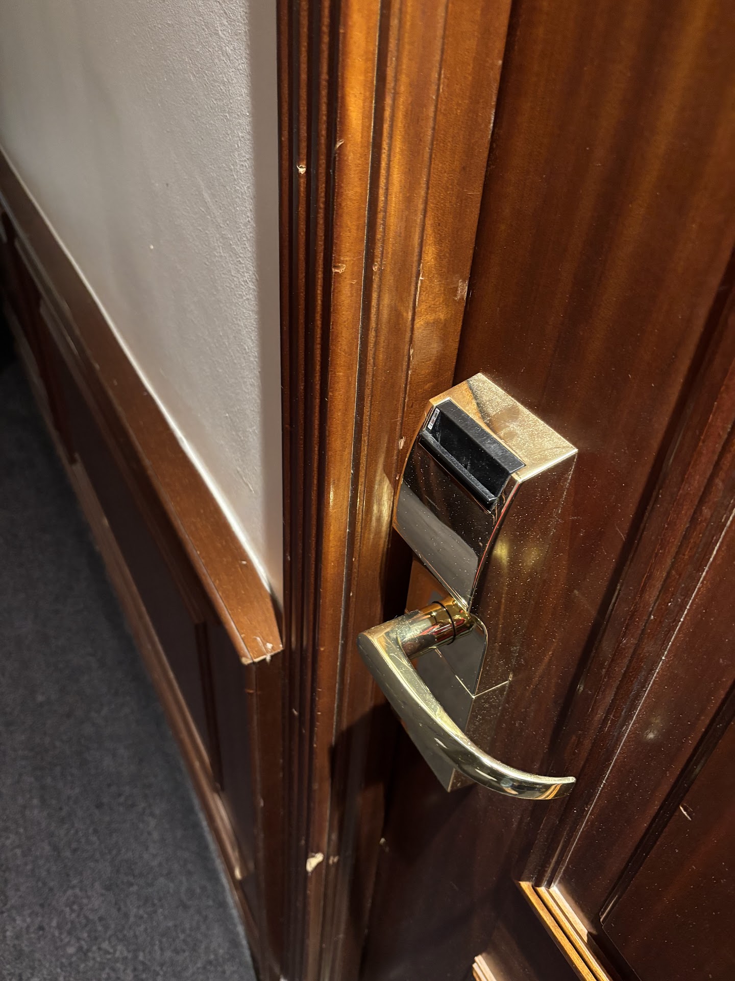 Fast forward to 4 AM. I was jolted awake by a guest in the adjacent room — not because they were partying, but because they were talking on speakerphone. Every zipper, every word, every light flicked on was coming through as if they were sitting on the end of my bed. Why? Because the only thing separating our rooms was a thin, standard wooden door that let light and sound pour through like it was made of tissue paper. The level of design failure here is mind-boggling. Who signs off on that and still claims this is a four-star experience?