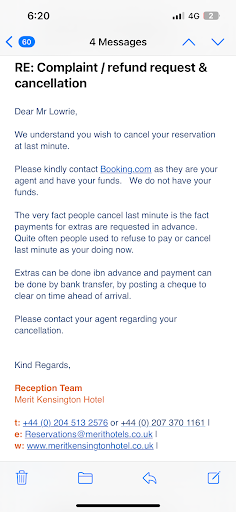 I booked the hotel for 10 Oct to 15 Oct 2023 (5 Nights). Our plan was to travel from Iceland to London via flight on 10 Oct. Unfortunately, I met with a medical emergency in Iceland and was not able to check-in on 10 Oct. We wrote in via email to Merit Kensington in the late afternoon of 10 Oct to inform them on our situation as soon as we were discharged from the hospital. We told the hotel that we will arrive on 11 Oct instead, and to keep our booking/room.