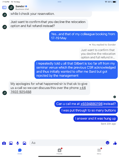 Sonder's "service recovery" was non-existent: They offered only "free cancellation," ignoring the fact that last-minute hotels in London cost a fortune, leaving me financially disadvantaged. After hours of fruitless calls and no solutions, I was incredibly told to walk 10 minutes to another Sonder hotel at 10 PM just to shower. They eventually moved me to Sonder The Henry for one night only, forcing me to vacate by 12 PM the next day, leaving me effectively homeless again. They proposed unsuitable alternatives (e.g., Sonder Gilbert, 50 mins from my seminar), which I rejected, but they then used this to deny a refund. They have refused to fully refund my original booking (and my colleague's, May 17-19, for joint meetings)despite their fundamental breach of contract (no hot water!). Their offer of a mere £150 compensation is insulting. A Sonder Customer Officer even personally promised will look into this and ensure I get my refund but went missing after that.