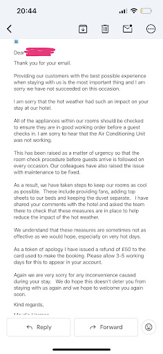 We took this matter further and have now only been offered £50 refunded back which they think is acceptable. All you do is take money which doesn’t seem to be going to much good use as you haven’t fixed the air cons in the hotel. So what are you actually doing with it? Never staying at a...