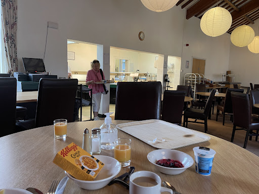 The rooms are a decent size but very basic. This is a university facility that lets out unused student rooms at a reasonable price for people visiting Manchester. It's within walking distance of much of the core university campus for Manchester, and is about two miles from the city centre. Taxi will cost about £6 in 2022. Busses are available and fairly frequent. The positives The nicest staff you could hope for. A really good continental breakfast that will set you up for the day if you don't want to spend money on lunch! (Lemon muffins hot from the oven will make you want to stay longer!) There is no cooked breakfast other than boiled eggs and porridge, but it's in the price. Take note of what I think is mid century design in the dining room. Curved hardwood arches support the church like roof. The library!! This is a gem!! The place feels monastic and with its name you can guess it's Baptist church origins however the agnostic content in the library and periodical rooms are excellent. It's an excellent working library. The courtyard with its covered walk on three sides is an oasis. Even in early march it feels tranquil with its fountain and moss covered cherry trees. The place was full of bird song and the traffic a distant hum. There are well serviced meeting rooms with good facilities. One, a Baptist chapple, the others standard office environment with electronic white boards. The common room with its spectacular light is very comfortable There is a bar that's very reasonably priced and free parking.