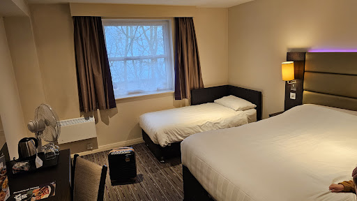 Read moreThis was a stop off en route to Scotland, I read previous reviews after booking and might not have booked if I’d read them first but really I have no complaints. We stayed in 9 different accommodations on our holiday around Scotland and this Premier Inn came in at number 6 on our list. After reading other reviews I was kinda dreading it but check in was easy and friendly and we were able to book our table for dinner straight away. The lady behind the bar in the restaurant was not overly warm and seemed a little laid back, kinda lackadaisical and ‘am I bothered’, I think maybe we were getting on her nerves and with her obvious elevated status she was able to pass us on to her younger team mates who were more comfortable to talk to anyway. I rated this Premier Inn over our number 7 Premier Inn because I absolutely loved our carvery dinner, the servers were lovely and wow…roast dinner with macaroni cheese (an acquired taste I’m sure) was absolutely delicious. Room’s were a little unkempt but we slept well and had no problem whatsoever with the wi-fi. Parking was easy and location for our purpose...