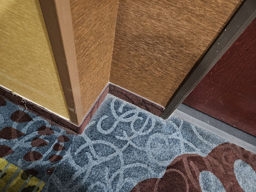 The hallway carpets have not been vacuumed along the walls and in the corners for a long time as you could see the dust where the vacuum cleaners could not reach. The carpet itself is coming apart in places with strings sticking out. The tile in front of the elevators is broken.
