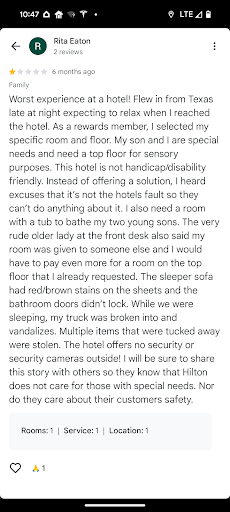 Read moreI had a very negative experience during my recent stay. I arrived to an unfriendly staff, I was given a room with a giant rip in the couch, food on the silverware, and my shoes stuck to the floors. I asked to be switched to a new room and received no apology or anything for that room. They switched me to a new room which was cleaner, but later realized that there was a rip in that couch too, albeit a smaller rip. I used the laundry facilities and used both dryers. One worked perfectly, the other was making a loud noise like it was broken and it did not dry my clothes. I went to tell them about this and before even leaving the desk the agent essentially told me it was my fault for overstuffing the dryer which was not the case because the clothes were still VERY wet and it was not a partial wetness from overfilling the dryer. I asked for my money back, she couldn't do it and said I had to wait for her supervisor which was fine but then she abandoned me and I had to re-explain everything to the supervisor. Again, neither of them apologized and the supervisor only very hesitantly gave me my $2.50 back so that I could use the other dryer. The next morning at breakfast they were out of stock of a lot of items and it was still around an hour before the breakfast was set to be done. They also charged $6 for parking which was insane to me because it's just a plain parking lot with tons of parking surrounding it. It's not downtown or somewhere where you'd typically expect to be charged for parking. I filed a complaint on Hilton's website. The auto reply said that my message was forwarded to the location and the manager would reach out to me within 3 business days. I waited two weeks and never received any response. I tried to email back and they wanted me to resubmit all the information I already submitted....