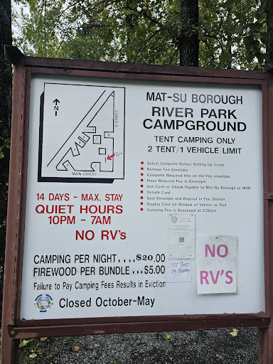 Read moreBare bones campground at the end of the town strip next to the river. 20$ a night, first come first serve (way too much imo). Camp host IS parked on site to monitor payments. Water is available, and flushing toilets, but they're not very clean at all. No showers. One picnic table and fire ring per site. No power. As in the rest of Alaska, expect plenty of mosquitos in the summer. Sites are very close together and best used for tent or car camping. No RVs are allowed. We stayed one night and it was a fine alternative to a hotel for a quick stopover in this super cute town. Wouldn't stay more than 2 nights due to nasty bathrooms and no...