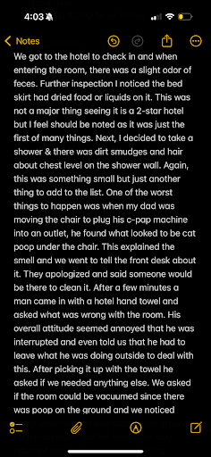 Read moreStayed for one night 10/1, Alexia helped me. She was wonderful and helpful. Walking into the hotel, it smells like cigarette smoke. I have pain in my ankle so I requested a room downstairs. Alexia then showed me both of the rooms which are pet friendly rooms. Both rooms smelled like dog and cigarettes. I then settle for an upstairs room on the second floor. The room stank horribly. Carpets dirty, the stomach from the room you can tell is from I cleaned carpets. There was a connecting door to the room next to me which I was apprehensive about. I was reassured that it locks in both sides. The bed cover had stains on it. Also to mention, I was only in town for one day and needed somewhere to rest and work until 4am so I didn’t plan on being in the room for more than 10hrs at most. The carpets are so dirty I wouldn’t advise walking on them without shoes. The room was a little creepy honestly. I opened the window because of the sell and there was a huge hole in the screen also the curtain had a cigarette burn on it. The desk was sticky and the desk chair was torn, you can tell many have used this room. I had to wipe everything down myself with Clorox wipes. Checked in 6:30p, worked until 10:30p, grabbed an extra sheet from Alexia to wrap my body in because I wouldn’t dare lay bare skin in that bed. I couldn’t really rest the energy of the room was crazy, every-time I would fall asleep I’d wake back up which is unusual for me. Around 12:30am the bed started shaking…I prayed, packed my belongings and left. I wouldn’t recommend this place not one bit. The only thing good here is the customer service. I paid about 99$ for the room but I guess it’s like you get what you pay for. I didn’t want to shed out over 100$ for a room because I was only going to be there for a few hours but next time I’ll just pay the higher prices elsewhere. Especially, if it guarantees me a peaceful nights rest in a clean, well kept room with no...