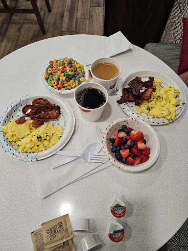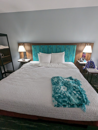 Read more🙂Pros: First I'd like to start with the fact that checkin was very fast and easy. The staff were polite and the hotel was clean. The room was clean, bed sheets clean, bathroom clean, and everything functional in the room. Parking was plentiful and right next to the doors for entry. They had functional luggage trolleys for our bags. The elevators worked appropriately and speedily. The mini fridge had a good amount of storage space. The king bed was comfy and spacious. The desk area was a nice touch and the rolling chair was comfortable. The AC unit worked great and held temperature. The pools were open and they had a nice outdoor fireplace seating area. Breakfast had a good selection and plenty of seating. Most importantly in my opinion, we felt safe at this hotel and it seemed very family friendly. We saw many families there. 😑Cons: They did not give us the room we reserved with two queen beds, Instead we were assigned a King bed with a pull out sofa bed. This was not what we wanted but since we traveled with kids we opted to let the kids try the sofa bed. We ended up with two kids in our bed. We also had no extra pillows for that sofa bed and there's no closet space in that room, just a hanging station. The next complaint is that we got a room at the very end of the hall near an exit door and we had to listen to the door slamming all through the night as people came and went. The walls are thin and we could hear so much outside noise. I did not sleep very well at this hotel. Also note, the water pressure in showers was not great. The last complaint is that the pool had not been skimmed at all. It wasn't super dirty but I could tell the filter was off; also the pool area had dirty towels...