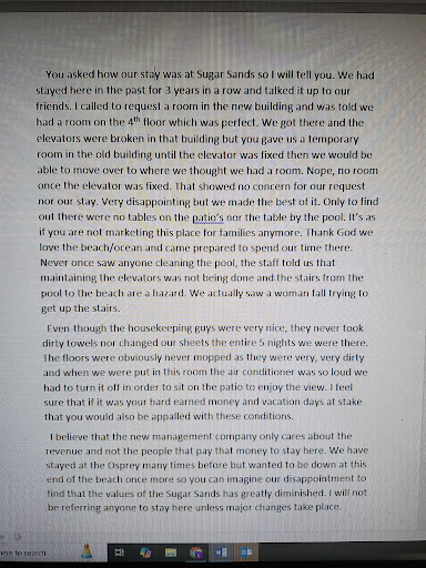 Read moreNOT FAMILY FRIENDLY, NOT PROPERLY MANAGED, NO CUSTOMER SERVICE, NOT A RESORT We stayed at Sugar Sands By The Sea for over 45 years for our annual family reunion. We will not be back after our experience this year. When booking the room and paying in full for our week reunion, we were assured that the requested rooms would be honored since we paid in advance for the week. This was not true - when I arrived with my sister, her room was not honored as Lindsey had said. After 1 hour on the phone with the 1-888 number we secured the correct requested room on the bottom floor for her. The clerk, LaToya needs to receive some training because you do not address people at check-in as "honey", but then she was in such a hurry to leave, maybe she didn't think and left her co-worker Amanda to deal with the us and several others that were upset with the property. Check in was 4pm - the rooms were not ready until 5:45pm. Since my family was not arriving until later in the week, I checked on my room number and was told by Amanda that the room number was correct in the system and I would have the bottom room requested. This was another lie. When I checked in on Wednesday, our room had been given away. Apparently after speaking with the group that was in the room that was promised to us, we found out they were charged double what we were. Talk about greedy - they were paid in full prior to my arrival and now since they could price gouge, they rented my room for more and placed us on the third floor. Utterly ridiculous. Overall our family had 10 rooms booked and only 3 were honored. To my disgust, a young man exposed himself at the gazebo with several small children around. IT IS PET FRIENDLY - they have a huge RAT that has a home in the left corner of the gazebo. The balcony railings are a hazard, pipes leak, showers leak, thus producing mold issues. They allow people to smoke marijuana on the balconies (but you can't smoke a tobacco cigarette). No rugs, sand everywhere and rooms are half cleaned when you arrive and every other day, they may ask if you need housekeeping at 7pm at night. If a cheap, overly priced rent by the night, rodent infested hotel is where you want to stay, then this is the place for you. No manager onsite, and when he (Fabricio) does make an impromptu appearance, he lies and disappears never to be heard from again. Upper management (Missy and Sandy) have never been to the property and do not know anything. Thanks By the Sea Resorts for ruining memories of a place that was once perfect for families like ours. WE WILL NOT BE BACK and neither will our family which consists of approximately 65 people, so, By the Sea Resorts, you may want to figure up...