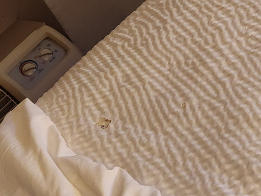 If I could give this place zero stars, it would still be too many. Traveling often for dog sports, I've stayed in some sketchy accommodations, but this is the first time I've actually left because a place was so bad. When I walked into the room, I thought the chair was just two-tone. Oh no! Someone thought no one would notice if they did a terrible upholstery job by covering a brown vinyl chair with white stick-on vinyl fabric to cover the worn places on the original fabric. It looked like something Leatherface (Texas Chainsaw Massacre) would create if he made furniture, and I referred to it as "the murder chair" to friends later. Not sure how anyone thought that chair was acceptable! Just throw it out already! The sink faucet came off in my hand when I turned on the water. Luckily, it worked and popped right back on, but WTF?! There were large gaps in the vinyl/laminate hardwood floor, and significant scratches in places where the furniture had been moved. Most of the power outlets had gaps where they didn't meet the drywall, had been half painted over, and/or were cracked. The tub faucet dripped all night, the bathroom tile was cracked, and the baseboard molding was pulling away from the walls. Pretty sure I found some mouse poop on the comforter of one of the beds. I would've checked out immediately, but there aren't many pet-friendly options in the area at 11 pm, so I put my own sheets and pillow on the bed without mouse poop and slept with the TV on because I was a little afraid of what might crawl out in the dark. My concerns were not unfounded because I awoke to multiple roaches crawling around the room in the morning. I was supposed to stay two nights, but I obviously checked out first thing in the morning. By far the worst hotel I've...