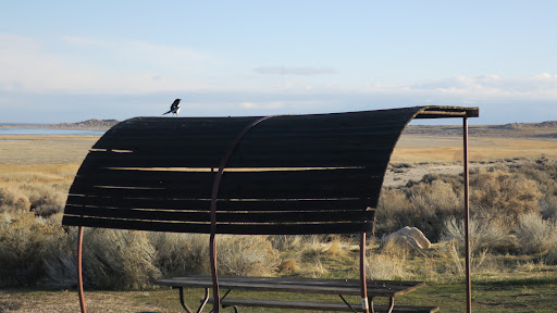 The campground consists of a long sloping bank leading down the edge of the Great Salt Lake. On the loop, there are 26 campsites to choose from. Each site has a long, easily accessible pull-through, a concrete slab with a sturdy gazebo, a picnic table, a smaller table presumably for preparing food, and a large concrete fire pit with a heavy iron grate. The grate can be lifted out of the way for an unobstructed fire.