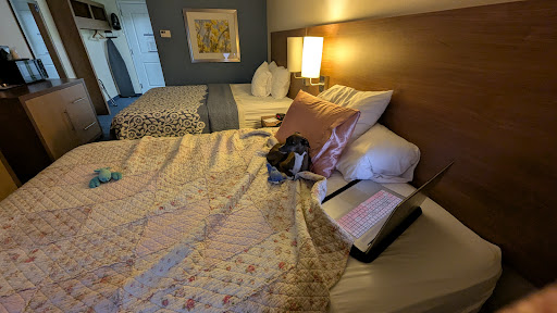 Read moreThe perfect short stay. Myself and two friends were each traveling with a dog. All 3 of us got our own rooms. When we booked they were very accommodating and put our rooms near each other and near the back door that leads out to where the dog potty station (trash can + potty bags) and large grassy area were. The rooms were clean and comfortable with convenient amenities like flat tv mini fridge, microwave, coffee/tea/hot water maker, full size hair dryer, iron with full size ironing board, desk. The climate control in the room worked great. The free breakfast options were plentiful. There was a convenient luggage cart for everyone to use located near the entrance/exit door of each floor While we didn't utilize them we loved that there was a guest laundry facility, gym, and vending machines with snacks and beverages all on the first floor, ice machines on every floor, and an elevator in addition to the stairs. We also loved that there was a patio with dining tables, chairs, and a propane grill for guest use in nice weather. The front desk staff and cleaning staff were very friendly and accommodating. It's located next to a large gas station with made to order food options as well as convenience items, not far from a local grocery store, and not too far from other things. Walking my dog there was peaceful in the morning. I felt safe and secure both in my room and around the interior and exterior of the property. All in all a great place to stop on our travels for a...