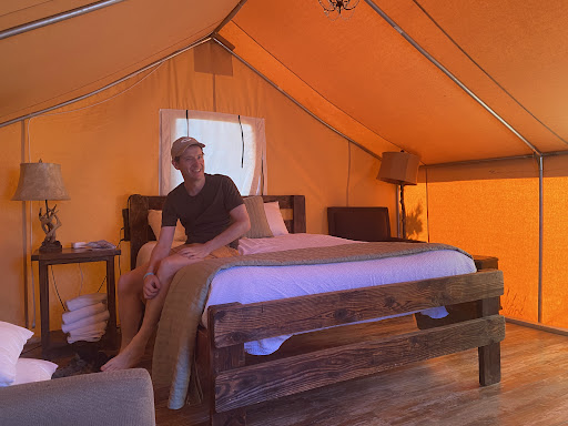 Our glamping tent was comfortable, although the door didn’t quite latch shut. The fan was great in the heat, and the shared toilets and showers were clean and well-kept. We really enjoyed the outdoor pool at sunset, cool and refreshing, and the hot tubs were heated with strong jets.