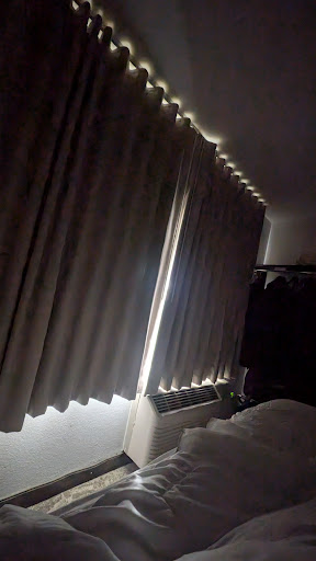 The room was overall comfortable. The bed was firm, but not so hard you could not sleep on it. We did bring our own pillows since we have found that some hotels have gone to these smaller than standard pillows. The pillows here were standard sized. They had remodeled the bathrooms with a walk in shower like they have in those "remodel your bathroom in one day". I was pleasantly surprised. When you signed in you could get "standard" WIFI. I was a tad bit nervous just using that since I did bring my work laptop. I did run a speed test on it and it was much faster than I was expecting. The next day I heard one of the guys checking our original room and he said, "Yup. This is an old AC unit and the curtains are blocking the airflow." I was impressed that I did not have to put the "Do Not Disturb" sign out because we did not need Housekeeping the first night we stayed. You can request Housekeeping. If you do not request it, they will not clean your room.