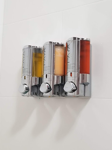 Bathroom clean, extra toilet paper, shower dispenser for amenities, and nice clean towels.