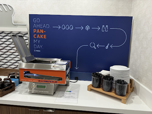 The breakfast was exceptional! Pancakes and also omelets. Egg/cheese omelets and also veggie and egg white ones with turkey sausage along with regular sausage links and patty options. Full yogurt and cereal bar. Bunch of juices. Cinnamon rolls, bagels muffins, bread. And their coffee machine takes a few minutes because it grinds each cup and then brews it for you. I also saw a water fountain for filling up water bottles. lol. The kitchen did have a tip jar out, which I 100% support because it was a fantastic breakfast!