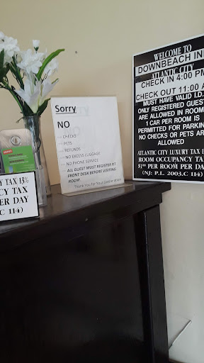 Read moreWe only stayed at the Downbeach Inn because we were not familiar with the area, and from the map, this property seemed convenient to the Atlantic City boardwalk, and was less expensive than the branded hotels (Caesar's, etc.). Interestingly, the name of this property had recently changed from the Rodeway Inn to the Downbeach Inn, so I wasn't able to find much info on the Downbeach Inn. After having stayed here, I feel the name change is to try to disassociate the property from the bad reviews listed under the Rodeway Inn. And I feel the bad reviews are warranted. As soon as we entered the room, we were hit with a foul odor. Then I looked at the box spring (visible as the comforter wasn't long enough to cover it), and the box spring had a hole in it. Things went downhill from there. The inside of the shower curtain was covered in mildew, everything in the room was not only outdated, but in serious need of repair. The comforter and mattress pad had cigarette burn holes in them. And I pulled down the sheets to get into bed and the sheets were not only filthy with black marks all over them, but there was a long brunette hair on the sheets (I am blonde and my companion has short gray hair), so this hair definitely did not belong to us. I was very grossed out and felt the sheets probably hadn't been changed from the previous guest. We went to the front desk and were given another set of sheets and we changed the sheets ourselves. I've included some photos which depict the condition of our room (#102). Some things I liked...there was plenty of free parking at the hotel and at lots directly across the street. We were also one block from the boardwalk/beach. Please note that the southern end of the boardwalk closest to this property is very deserted and the buildings are vacant, so there's not a lot of foot traffic at night. I would not recommend this hotel. Instead, spend a little extra to stay closer to the activity on the boardwalk in a...