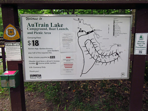 Over a 5 night stay the campground was peaceful in the afternoon and evening with the sound of gentle lapping water serenading the day away. Most sites had good brush growth between them, creating a private feeling behind each gravel pull-in. There are no electric sites, most are reservable with a few available on a first-come basis. There's running water and clean outhouses. AuTrain Lake is cool and clear with a sand beach and boat dock. Noticed several kayakers, boaters, and beavers bobbing around on the calm waters. There is an observation deck and 2 mile trail system that will make you feel like you're in a bird sounds soundtrack, with educational markers identifying the different bird species present in the area. Reliable and long burning firewood was available and in abundance by the host site with reasonable prices.