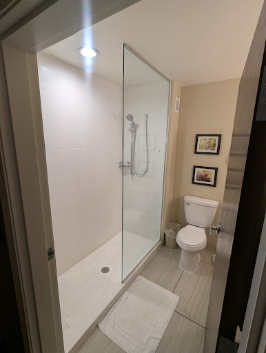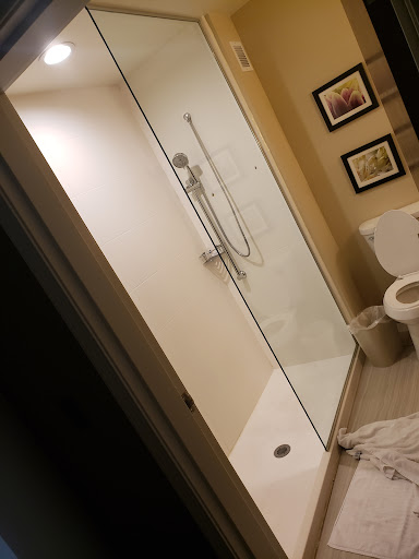 The shower in the bathroom was hard to use. The shower head is on a slide. You can move the head up and down on the slide, but you can not get the shower head to stay in an upright position. My husband is 6'3". With no shower door, it was difficult to prevent water from getting on the bathroom floor.