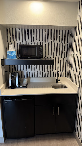 Read moreWhen I booked this hotel because of its proximity to Austin Bergstrom International Airport, I was unaware that it opened just a year ago, which means everything still looks and feels very new. During a five-day visit to the region, we stayed in three wonderful hotels, two of them historic with lots of charm. But it was wonderful to spend the final night in the Lone Star State in LIKE NEW accommodations.||Adjectives that come to mind as I walked around this very thoughtfully laid out property were gleaming, sparkling, immaculate, cutting-edge, modern. From appliances at the beverage bar to equipment in the fitness room to TVs mounted in the guest quarters, most everything looks fresh and functions perfectly.||As noted on their website, the following are Atwell Suites' signature hallmarks:||1) "Flexible & Enriching Spaces include modern suites designed with distinct zones for work and rest, with functional workspaces and a comfortable lounge area complete with well-crafted design touches like a gallery wall above the in-room sofa...The lobby areas mix private and shared spaces in a thoughtfully designed space that incorporates elements that pay homage to local Austin culture and Texas traditions."||During my brief visit, I took advantage of the inviting "restaurant" that doubles as a lobby. A variety of seating configurations and two different TV monitors offer several options for guests. Had I been staying for more than 24 hours, I would have taken advantage of the Fitness Room, which is spacious, well equipped with a variety of workout machines and supplies, and meticulously maintained. Atwell seems to have gone out of its way to design a variety of comfortable work spaces so that you can separate work from rest and relaxation in your room, although the guest rooms are, certainly, designed for remote work.||2) "Food & Drink to Start & End the Day includes complimentary breakfast in the morning featuring a variety of quality hot and cold items such as overnight oats, vegetable egg white omelets, and the brand’s signature Churro donut. Guests...also have access to a self-serve Refreshment Stand, featuring bean-to-cup coffee, still and sparkling water and tea 24/7. In the evenings, guests can share small plates with friends."||My brother and I shared three small plates-buffalo wings, hummus, and a chicken flatbread. While the small plates menu options are limited, there is a good variety and what is served is prepared well. Our three small plates easily satisfied our evening appetites. A few alcoholic beverages-beer, wine, and cocktails-served in bottles and cans, are offered.||3) "Genuine Connections inspired by conversation starter coasters at the bar, a shared TV lounge, games and puzzles placed throughout public areas, and themed events that bring guests together."||The layout of furniture and the provision of games and conversation coasters do encourage interactions between guests. I am including the offering of an airport shuttle in this category because the drivers are quite pleasant and engaging. It should be noted that after 3 PM, the shuttle shuts down for the day and a rideshare provider will be contacted for trips to/from AUS.||Atwell Suites has created a brand for our times when travel is exploding and many people can work from anywhere. The innovative layout of guest rooms and shared spaces should appeal to all generations and to those traveling for business...