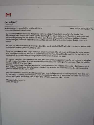 Today at approx 5:30 pm I showed up to collect the keys for my room at the budget inn off of I-35 in Austin. I am a transgender woman so I may appear different to some people and my car doesn't have AC and I was a bit distraught because my living situation is unstable and I was coming so I could have a night of peace before work in the morning. I am a bus driver so as you can understand sleep is important to me. The person working the front desk at approx 5:30 pm on August 7th, 2020, asked me to fill out my name and I scribbled it down because I thought it was in the system electronically. She asked me to write it more comprehensibly, and I did as she asked. She then asked if I needed another card, to which I replied, "You can't read that?" She said she could not. So without knowing what else to do, I tried to write it more slowly and legibly for her not knowing if she could read my normal handwriting (which is admittedly messy) if she gave me another card. She must have took offense to this because she then refused me service saying I had an "attitude." I asked what I had an attitude about because I was puzzled at the time, and then apologized even though I was unsure what she took offense over until later because in my view what I did wasn't done with the intent to offend anyone. I then tried to explain my situation but she refused to interact with me at all from that point forward. The result is that I had to go back home to my roommate who won't let me sleep due to playing loud music. What the employee did was uncalled for and though I admit that I could have handled the situation better (I was surprised and bewildered and panicking about work the next day) I genuinely don't think writing my name down on a piece of paper warranted a denial of service. I won't be coming back and I won't recommend your hotel to anyone in the future. It is ridiculous to deny service over such a minor matter as writing a name on a piece of paper. Btw the response form on their website is broken so if you go through the same thing don't...