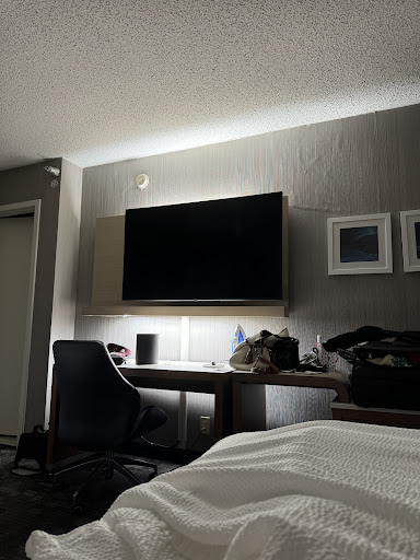 The hallway smelled quite stale that I was concerned for my room. The smell of the room was fine. I immediately notice my wall hvac unit was cracked and broken, but still seemed to work. The curtains were closed so it was dark in my room. Usually a cleaned room has curtains open and some lights on. The TV is crooked. The mount seems straight so my guess is someone messed with it and when seating it back caught a cable or something and now it sits funny. It looks trashy. At the desk below the TV there are no accessible outlets. I did find one, at the full reach of my power supply and I had to move furniture to get to it. This needs to get resolved for future business clients. The desk seems to be part of the furniture set but they don't line up, and it looks like it was spare furniture - busted up on one corner, and the laminate was warping on another part, and the two pieces don't line up - just looks thrown together. The corner of the carpet looks like it hasn't been vacuumed in a while. The light switch for the over-desk lamp is actually behind the TV. It took me a while to find it before going to bed. The shower hot/cold water nozzle is marked backwards. Hot is cold, and cold is hot. I had it on hot for a while thinking it needed to warm up or something. As I went to give up on a shower and turned it back towards cold I noticed it got hot. A small detail, but I didn't have a floor towel. Not sure if this property uses those, but not sure I have ever been in a hotel that didn't have one. Seemed like an oversight. I am 6'2", and the mirror in the bathroom wasn't tall enough. I had to duck down and squat a little to mess with my hair in the morning.