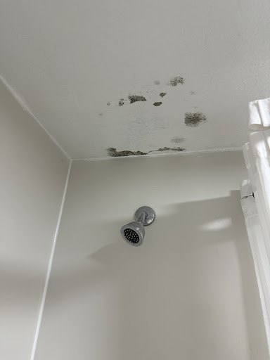 The bathroom door wouldn't close without considerable effort because it was warped and stuck against the warped floor. It's no wonder there was humidity damage and a musty odor because the ceiling fan was missing. Instead, there was just a rough-cut hole in the ceiling. We saw a large grasshopper or cricket multiple times that would not leave the room in addition to a possible termite in the bathroom. We also had to duck down to use the shower, and we're both average height.