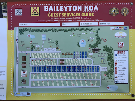 We have been visiting this area of Tennessee, and this campground for years. The owners, The Clouser family, have made a great number of improvements to the property since purchasing it and becoming a KOA campground. Some of these would include a completely refurbished bath house and laundry, installation of a salt-water pool, fenced dog park, playground, and new rental cabins. The campground, which is easily reached from about 1.5 miles off I-81, is on dozens of acres of open fields, wooded areas, with surrounding hills and mountains, along with 3 stocked ponds and miles of adjacent walking and hiking trails. The grounds are kept immaculately landscaped, and the facilities are spotless. The sites are level,nicely spaced with full hook-ups...free WIFI is available, and are long enough to accomodate any RV. There are also tent camping sites available. The owners/staff...Karen, Bob, Steve and Chris, are very helpfull and friendly, often going out of their way to help in whatever capacity.....helping you back your RV into a site, picking up your propane tank for a refill, or recommending a local attraction or restaurant. In summation, I would highly recommend Baileyton KOA, close enough to any bigger attractions in the area, but still a quiet piece of eastern Tennessee....we consider it like a home, and hate when we...