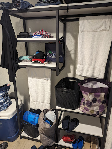 There was no closet, clothing rod, hanger, or even a hook in our room to hang our clothing.