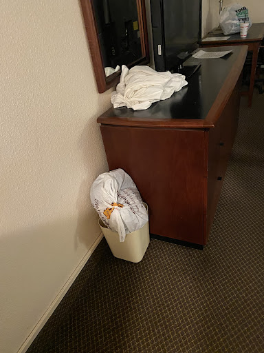 Next, the window seal was rotted and there were chunk of debris from the window area in the floor beside the HVAC. The curtain was also hanging down off a broken connector above it. Not a big deal, but not a good look. On the ceiling above the bed, the popcorn tiles or paint was pealing off in a few places. The floors looked like newer LPV in the room, so better than carpet as we suspected it was easier to clean. The toilet (when flushed) had water come almost to the rim before slowing going down. My daughter was terrified to use it, but had to at one point. We had no soap or any other bathroom products in our room and there was no ice bucket. We did have rags and towels and a clean bed. Fortunately we brought our own soap. The ac worked ok. The shower we didn’t use as the walls of it looked a bit suspect (unclean) and again, it was only a one night stay.