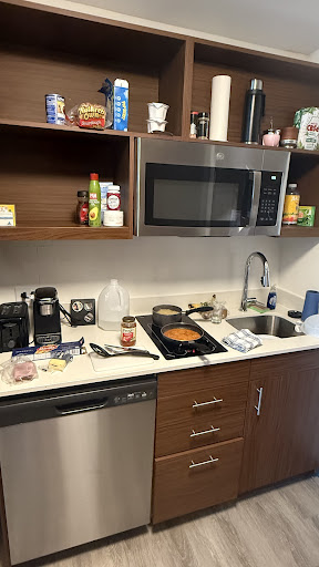 Read moreSuites are OK, only a few weeks old so everything was in pretty good shape. Kitchen was min equipped, but good enough. The store by the lobby is very expensive. The a/c is nice and cold but blows right on the bed and is loud. Floors are dirty, will turn your feet black. The comforter smelt really bad, and I asked for another one and they were happy to replace it. I recommend bringing a case of water, don't use the water from the tap. The wifi is pretty bad, I needed to work from my laptop and had to use my personal cell hot spot instead. Staff is very friendly. Parking spots can be hard to find. Lots of usb ports for charging. Bathroom door is 'barn door' style and there is very little privacy. I noticed the noise from the room travels a lot and same for the hallway cleaning crew. Bed was firmer than I would prefer, but pretty good. No tissue box for whatever reason so I got one. The TV is pretty old, and I couldn't use my phone on it and only has antenna channels. There is no alarm clock, you have to ask one, you have to also ask for a clothes iron. The driveway washed out, so you have to go the wrong way into a neighborhood to reach the parking lot. There is a lot of dirt on the carpet in the hallways and stairs from the crews working the area. Unfortunately, nobody is cleaning it up so it's getting ground into the carpet. There is a patio at the back of the building with some grills. Currently it's 9:30 pm and its blasting vulgar music. There is very little if any water pressure...