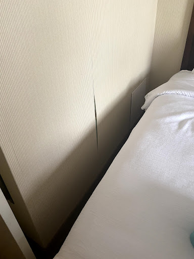Room The AC didn't work when we arrived and it was too late for maintenance and we were too tired to move. We slept horribly with the heat. It was "repaired" the next morning, but it still wasn't cool enough. Our cousins arrived the next day and their AC wasn't working either. I'm not sure if switching rooms really helps?; the AC seems to be repaired on demand rather than proactively. Multiple stains on the carpet The couch is quite old; the fabric was worn off of the cushion edges The shower drain looked a bit disgusting from the years of use. Everything is old: burnt out compact fluorescent bulbs, chipped paint, and the electrical sockets on the lamps were too worn to hold prongs. One of the two television remotes didn't work. One of the two telephones didn't work. Generally the room looked quite old and tired.