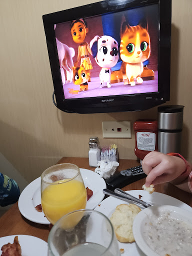 Room has a nice tub and a bar thing so you don't kill yourself slipping. Toiletries are the nice Dove dispenser Beds are real queen size and bed/ pillow quality as expected from an HIE (which is why we chose HIE just keep away from their Indigo brand. Not worth it!) AC works as it should Water pressure was good and shower was the right working condition. Tub was also the right depth to enjoy a soak. It's also one of the few hotels that seems to have an exhaust. The room was great for a traveling working person. So many sockets! Also a nice table under the tv that can be moved, so i didn't need to work with the tv in front of me like in other HIEs we stayed in during this Summer road trip. Parking available on site We had breakfast there and the children loved the bacon and biscuits. They even had scones for those who would want it. Soda and juice options plus a non lactose option for milk! A big plus for someone with a lactose intolerant child. The booth seats had a small tv that entertained the twins with Disney Today was sausage (my phone idiotic wrote gross instead of sausage), biscuit with sausage gravy, bacon, scrambled eggs, French toast, and bacon. Fresh fruit available and the usual cereal.