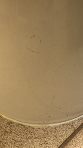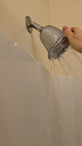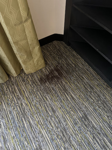 The floor was filthy, and I even found a sewing needle on the carpet! Not stick in the carpet, just laying there. The bathroom had broken bottom drawers. The door opens right into the sink, and it won't stay open, out of the way. The shower nozzle was covered in hard water corrosion. It leaked horribly, shown in the video. The tub didn't drain well at all, collecting water with the drain open. Shown in the other video.