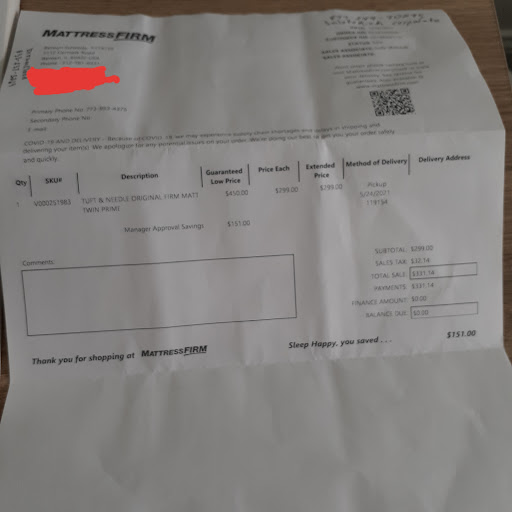 I went here on 5/24/2021 the sales person Judy was very kind and helpful, Thank you. But I will never purchase a mattress from Mattress Firm again. I called about exchanging my mattress for a better quality and I was told by a salesperson I couldn't because mine was on clearance. When I talk to the person that sold me the mattress she explained to me I could exchange it for a better one, but Mattress Firm charges a 10% Restocking Fee and $99 for delivery so I would have to pay them about $130 extra to pickup the mattress. But as you can see nothing is noted on my receipt concerning this return or exchange fee. Now the sales person put the mattress in my truck and I drove it to my building and had it took to my unit. So why is it that I can't have it put back in my truck and take it to Mattress Firm warehouse? So this company makes money off you no matter what and they turn around and sale what you returned and make more money. If this is a normal sale situation I wouldn't know. I've never returned a bed I've purchased. I will also be contacting the Better Business Bureau concerning this...