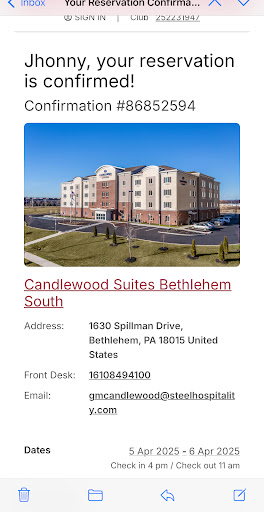 Read moreI booked the Candlewood Suites Bethlehem one year in advance for a college graduation weekend, and I booked two rooms at the same time—one for 4 people (my husband, me, and two adult children) and one for 1 person (grandma). The reservations system on the website offered two King Suites, which I booked. I erroneously assumed that a King Suite had a pullout couch since the King Suite was offered as an option for a customer seeking a room for 4 people. When we arrived, neither King Suite had had a pull-out couch, so 2 in my party of 4 had nowhere to sleep. We had an uncomfortable night, and we left a day early. After a series of unanswered messages to the manager and a complaint filed with headquarters, a customer service representative on the phone explained to me that when a room says it “accommodates” four people, that doesn’t necessarily mean it sleeps four people. 🤔 And when the manager in Bethlehem finally called me after I'd filed a complaint, she told me that when someone books two rooms at the same time, the booking algorithm assumes all members of the party can sleep in any room no matter what you input as number of people per room--which by the way, STILL wouldn't have accommodated my party totaling 5 people unless one adult child shared a bed with her grandma and the other adult child shared a bed with her parents. The manager also told me that the onus is on the customer to book one room at a time. Our two day stay cost over $800 because it was a graduation weekend, and the Candlewood Suites would not refund any of our money.||If you do roll the dice and book here, make sure you you book one room at a time, and consider calling to double check that they can actually “accommodate” everyone in your party with an actual bed...