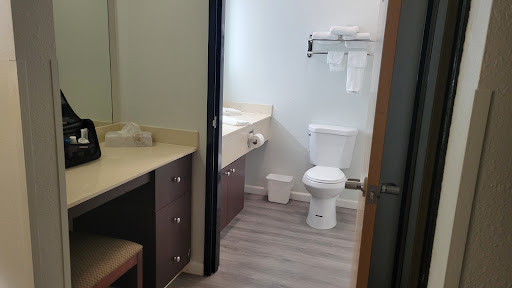 I arrived around 9pm on a Sunday, and the front desk person handled business without any pleasantries, but not rude. When I walked into the room, I was initially impressed. There was a kitchenette, desk, couch, coffee table, TV, dresser, bed, dressing area, and bathroom, and the room was sizable. Unfortunately, the room was also poorly remodeled. At least one light switch didn't do anything, one of the lights wasn't working correctly (bad ballast?), caulking was insufficient and poorly done, wall texture where repairs had been made were obvious, and corner protectors didn't reach the baseboards. The room was also not clean. I walked around barefoot for a while, and my feet had so much debris stuck to them I had to wash them and wear shoes. The microwave had crumbs in it, someone's drink was in the fridge, and there was a dirty line in the tub. The towels appeared clean and without stains, but the pillowcases were suspicious, with hairs stuck to them. The room had 4 full size bottles for lotion, shampoo, conditioner, and soap attached to the wall, and one small individually wrapped bar of soap. The lotion bottle was falling off the wall. There was a sign on the hall to be quiet, but the door closer on the door didn't work, so the door slammed. The breakfast selection was better than I've seen elsewhere; biscuits, gravy, sausage, scrambled eggs, 4 kinds of cereal, 3 kinds of juice, coffee, yogurt, English muffins, bread, bagels, sour cream, milk (a gallon, not individual containers), and waffles (but the machine was out of order). I didn't go to the pool area.